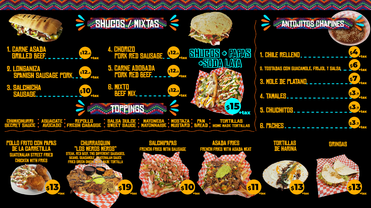 Overall, the menu at Shucos Los Meros Meros delivers a vibrant and satisfying taste of Guatemalan street food, balancing hearty comfort dishes with bold, authentic flavors. Standouts like Shucos Papas Y Lata de Soda, Beer showcase the restaurant’s signature street-style sandwiches, while Pan Con Chile Relleno Y Chuchitos highlights a traditional combination that feels both rustic and deeply rooted in Guatemalan culinary culture. The Pollo Frito Con Papas De La Carretilla Guatemalan Street Fried Chicken with Fries stands out for its crispy texture and generous portion, making it a crowd-pleaser, while the rich and comforting Caldo de Res offers a homestyle experience perfect for those seeking something warm and nourishing. Meanwhile, Dobladas bring a satisfying crunch and flavorful filling that rounds out the menu nicely. Altogether, the offerings feel cohesive, affordable, and true to their origins, making the restaurant a reliable spot for anyone craving authentic, street-inspired Guatemalan cuisine.